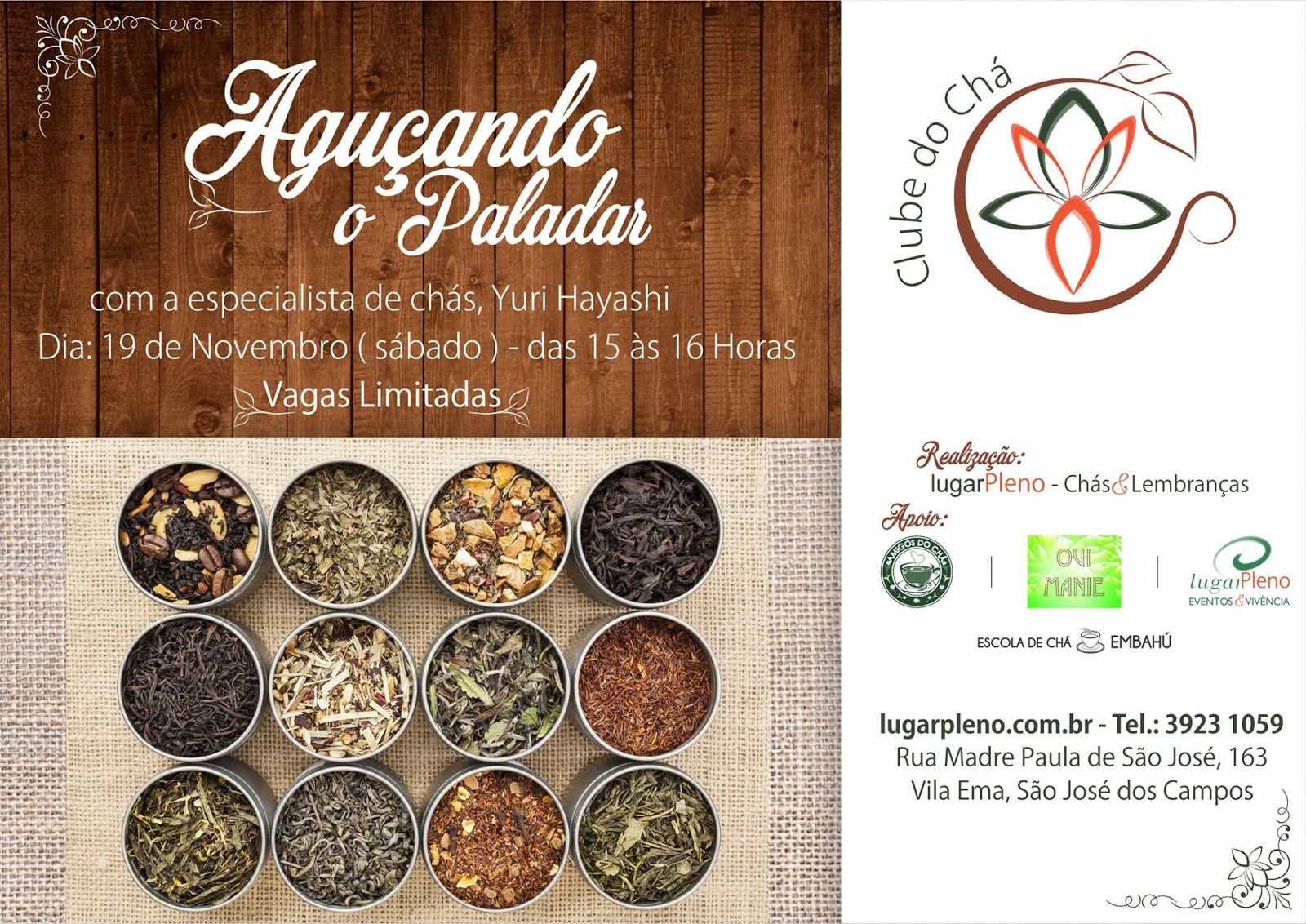 “Neste próximo sábado (19/11), a partir das 15h, teremos um workshop e degustação com a consultora e especialista em chás Yuri Hayashi, autora do blog Chá, Arte e Vida e da Escola de Chá Embahú.